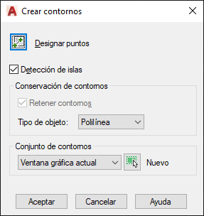Le solicita que designe los objetos que definen el conjunto de contornos. CONTORNO sólo incluye los objetos que se pueden utilizar para crear una región o una polilínea cerrada al generar el nuevo conjunto de contornos.