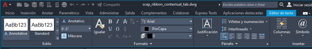 Al seleccionar un tipo de objeto específico o iniciar determinados comandos, se muestra una ficha contextual de la cinta de opciones especial en lugar de una barra de herramientas o un cuadro de diálogo. La ficha contextual se cierra al finalizar el comando.