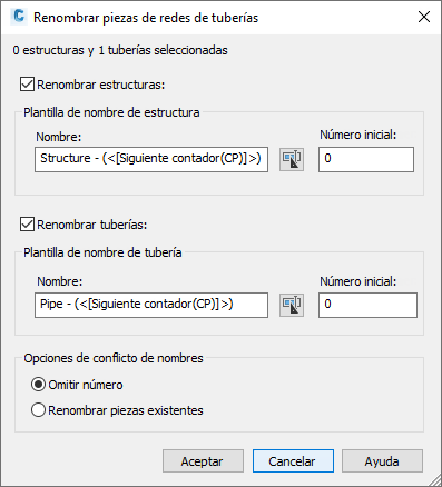Puede seleccionar el cambio de nombre y numeración sólo para tuberías, sólo para estructuras o para ambas.