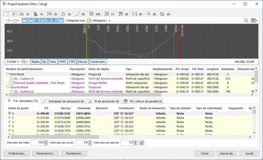 La ventana Project Explorer se divide en una serie de fichas de categoría de objeto. Cada ficha de categoría de objeto proporciona una serie de herramientas de revisión y edición de diseño que están diseñadas específicamente para la categoría de objeto seleccionada. Toda la información que se presenta en la ventana Project Explorer se actualiza cuando se aplica un cambio de diseño de cualquier orden en Civil 3D.