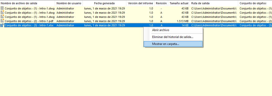 Para revisar el historial de todos los informes y todas las hojas de cálculo que se han generado a partir del dibujo actual, vaya a la ficha Conjuntos de objetos de la ventana Project Explorer y haga clic en el botón Ver historial de la barra de herramientas principal Conjuntos de objetos. Se abre la ventana Historial de salida.
