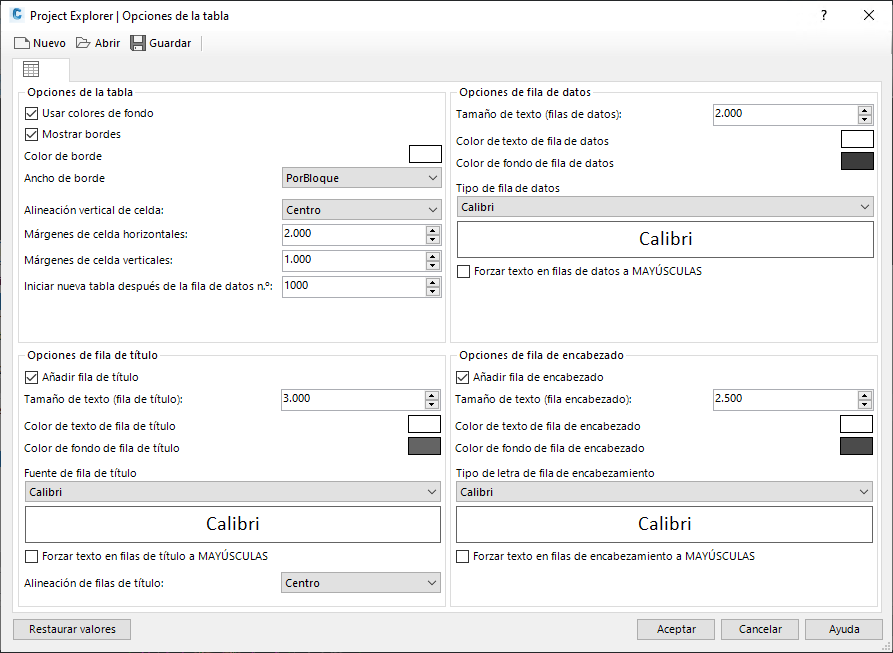 Las Opciones de tabla determinan el color del borde, el tamaño y el tipo de fuente, los márgenes de celda y el estilo visual general de todas las tablas de AutoCAD generadas a partir del Project Explorer.