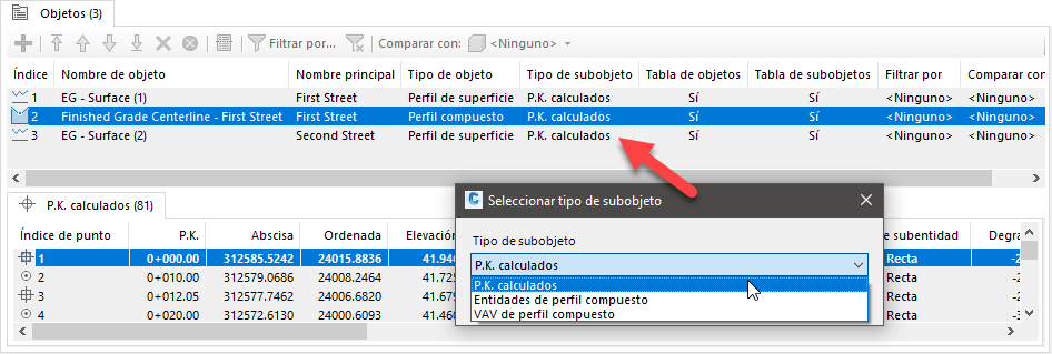 Para algunos tipos de objeto de Civil 3D, hay disponibles tipos de subobjeto para un Elemento de conjunto de objetos de la lista. Por ejemplo, para las alineaciones, es posible generar un informe que incluya P.K. calculados, entidades de alineación, PI de alineación o P.K. críticos de peralte.