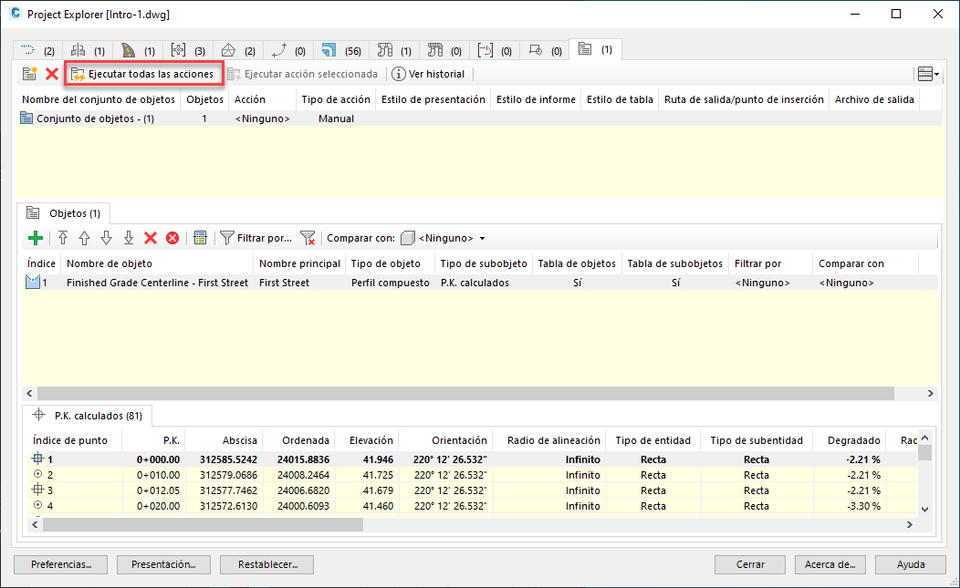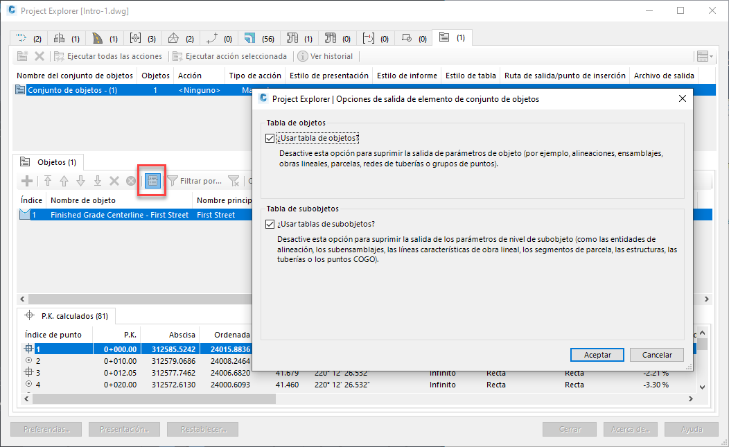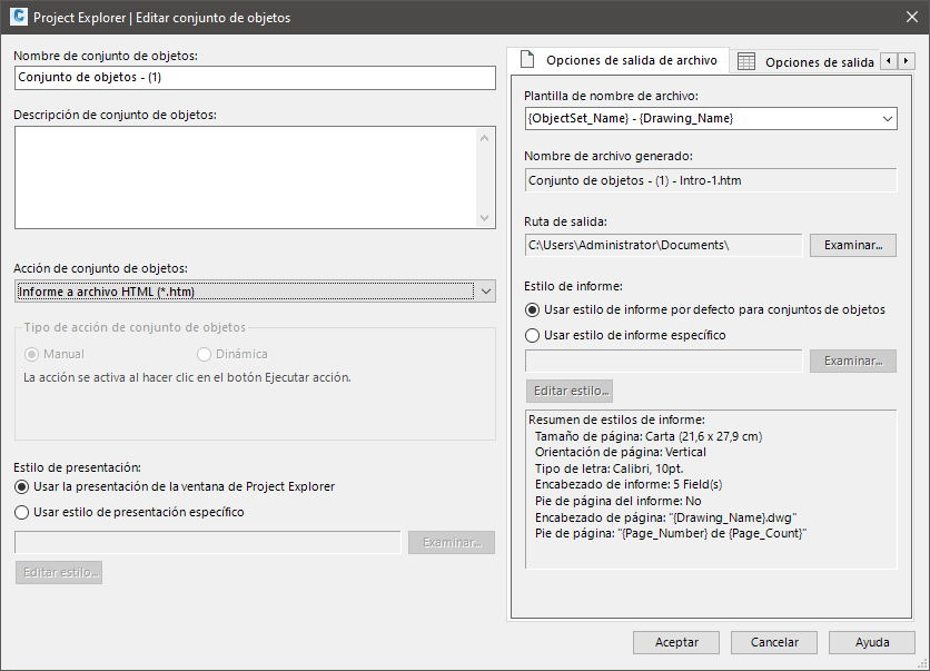 Un Conjunto de objetos es una lista de objetos de Civil 3D que el usuario puede definir y a la que se puede asignar una acción y otros detalles relacionados. Las acciones se pueden activar manualmente o, en algunos casos, dinámicamente cuando el Project Explorer detecta que se ha modificado una pieza dependiente del diseño. Por lo general, los Conjuntos de objetos se utilizan para automatizar la producción de informes preconfigurados, hojas de cálculo, dibujos de AutoCAD o tablas de AutoCAD, y la combinación exacta de estilos, filtros e instrucciones de salida necesarios depende del tipo de acción y objeto que se asigne.