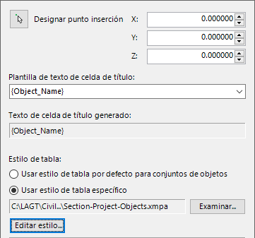 Utilice esta opción para determinar la ubicación de la esquina superior izquierda de la tabla o tablas de AutoCAD creadas por cada Conjunto de objetos. La ubicación se puede especificar escribiendo una coordenada XY en la ventana o indicando un punto en la ventana de AutoCAD.