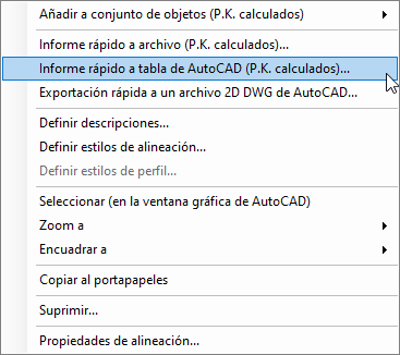 Para algunos tipos de objeto, puede elegir el tipo de subobjeto que se incluirá en una tabla de AutoCAD. Por ejemplo, para las alineaciones, es posible generar una tabla de subobjetos que incluya P.K. calculados, entidades de alineación, PI de alineación o P.K. críticos de peralte.