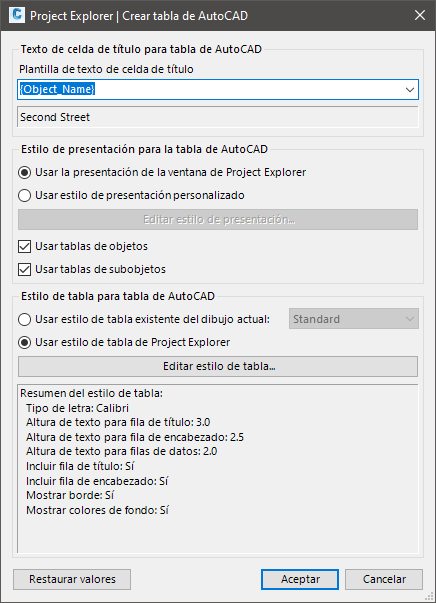En la ventana Crear conjunto de objetos, elija un Estilo de diseño y un Estilo de tabla y defina el punto de inserción de las tablas que desea generar. Por último, elija si las tablas deben actualizarse de forma manual o dinámica. Las tablas se pueden generar haciendo clic en el botón Ejecutar acción de la ficha Conjuntos de objetos de la ventana Project Explorer.