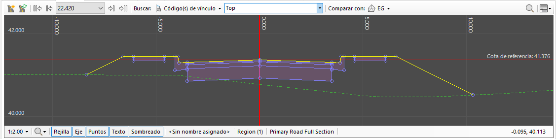 La Vista de obra lineal de la ficha Obras lineales muestra una sección dinámica a través de la obra lineal seleccionada en un intervalo de ubicaciones de P.K. o cadenada. Utilice las flechas hacia delante o hacia atrás o la lista desplegable de P.K. disponibles en la Obra lineal para seleccionar el P.K. en el que se mostrará una sección. La opción Buscar de la barra de herramientas se puede utilizar para resaltar códigos de punto, vínculo o forma específicos en la Vista de obra lineal. Los códigos se pueden seleccionar en una lista desplegable o escribir en el campo como una lista delimitada por comas donde se deben resaltar varios códigos.