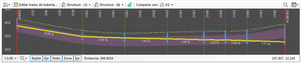 La Vista de conducto de tubería de la ficha Redes de tuberías muestra un perfil dinámico a lo largo de la ruta de tubería más corta entre dos estructuras de la red de tuberías seleccionada. Utilice las listas desplegables de estructuras de la barra de herramientas para seleccionar una estructura inicial y final para el conducto de tubería. Utilice la opción Editar conducto de tubería para ajustar la pendiente de cualquier tubería que se muestre en el conducto de tubería actual.