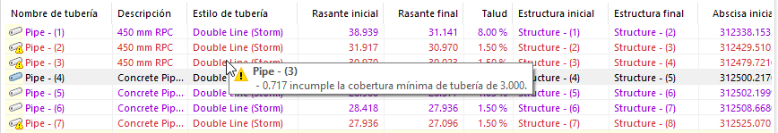 - Tuberías: {y} infringe la pendiente de tubería mínima {x}.