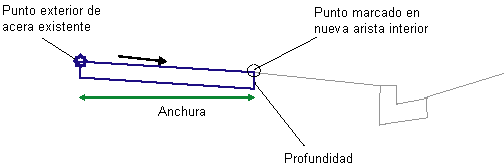 | Anchura | Anchura de la acera medida hacia dentro desde el punto del borde alto de la acera |