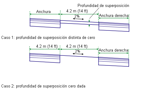 Si la profundidad de superposición se define como cero, los carriles de ensanchamiento se insertan hacia fuera de los desfases de inserción con la pendiente existente.
