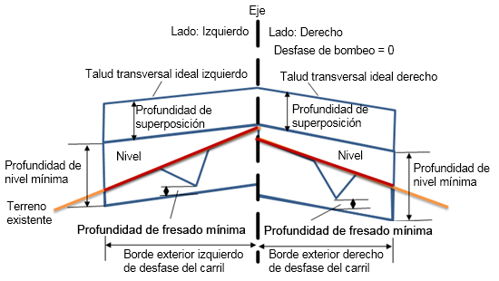 | Profundidad de nivelación mínima derecha | Profundidad de nivel mínima entre la parte inferior de la capa de fresado y la parte inferior de la capa de superposición en el lado derecho. | Numérico, positivo | 0,600 m |