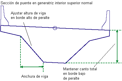 El subensamblaje construye los vínculos para la losa y la subestructura del puente de acuerdo con los parámetros de entrada precisados. En el peralte, no toda la estructura está rotada. El valor de Profundidad de sofito se mantiene en el valor determinado del borde superior de la losa en el borde bajo del puente y la altura de la viga se ajusta a la raíz de la losa en el borde alto.