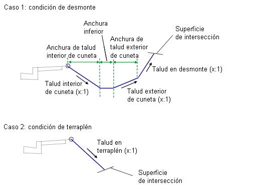 El punto de enlace se comprueba para determinar si está en desmonte o terraplén. Si está en terraplén, el vínculo de intersección en terraplén se extiende hasta la superficie de intersección con el talud en terraplén indicado. En caso de desmonte, se añaden el talud interior, el exterior y la parte inferior de la cuneta, mientras que el vínculo de intersección en desmonte se extiende desde el extremo del talud exterior de cuneta hasta la superficie de intersección con el talud en desmonte indicado.