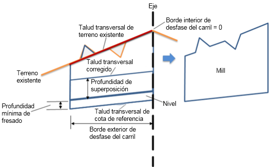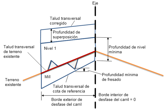 | Profundidad de fresado mínima | Profundidad de fresado mínima entre la parte inferior de la capa de fresado y la parte inferior de la capa de terreno existente. | Numérico | 0,300 m |