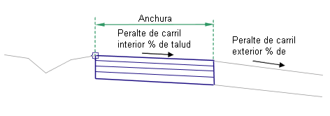 El talud de peralte del carril interior se obtiene a partir de las especificaciones de peralte para la alineación de línea base. Comenzando en el punto de enlace, se insertan una superficie de rasante y una capa base paralela con los valores de anchura, profundidad y talud de peralte indicados. Los vínculos verticales cierran la forma en cualquiera de los extremos del carril.