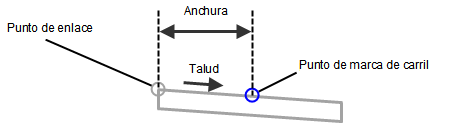 Se añade un vínculo desde el punto de enlace hasta la anchura y el talud especificados, en el lado especificado. La anchura del vínculo se determina al multiplicar el parámetro Anchura de carril por el parámetro Ubicación de marca de carril. En el otro extremo del vínculo, se añade un punto con el código especificado.