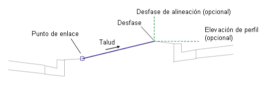El punto de enlace se encuentra al comienzo del vínculo. La dirección del vínculo viene determinada por la ubicación del desfase y el talud dados.