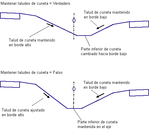 El peralte y los carriles de giro pueden hacer que los taludes de la parte superior de la cuneta se encuentren a distintas elevaciones en los lados izquierdo y derecho, lo que genera una cuneta asimétrica. Existen dos opciones para resolver esta situación. Si Mantener talud de cuneta se ha definido como Verdadero, los taludes de la cuneta dados se mantienen constantes en ambos lados y la parte inferior de la cuneta se desplaza alejándose del eje hacia el lado inferior. Si se ha definido como Falso, la parte inferior de la cuneta se centra en torno al eje de la mediana, el talud dado se mantiene en el lado inferior y el talud se ajusta para hacerlo coincidir en el lado superior.