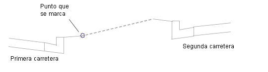En el siguiente ejemplo, existen dos carreteras con perfiles independientes. Una vez que se crean los vínculos de la primera carretera, se marca el punto situado en el borde exterior izquierdo. Después, una vez creados los vínculos de la segunda carretera, se puede insertar un vínculo desde su borde exterior derecho hasta el punto marcado.