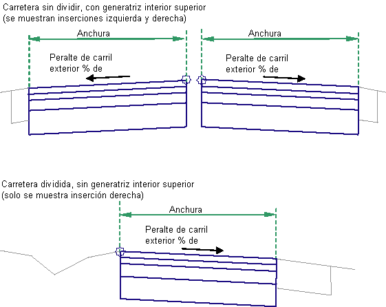 Comenzando en el punto de enlace, se insertan una superficie de rasante y una capa base paralela con los valores de anchura, profundidad y talud de peralte indicados. Los vínculos verticales cierran la forma en cualquiera de los extremos del carril.