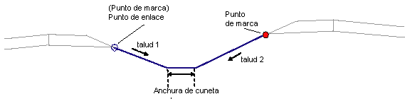 Se determinan las ubicaciones del punto de enlace y el punto marcado. El punto marcado puede encontrarse a la derecha o a la izquierda del punto de enlace. Los vínculos se extienden hacia dentro con el Talud 1 desde el punto de enlace y con el Talud 2 desde el punto marcado hasta que se intersecan. Si se especifica una anchura de cuneta distinta de cero, se ajusta un vínculo de parte inferior de la cuneta horizontal en las pendientes de los taludes que se intersecan.