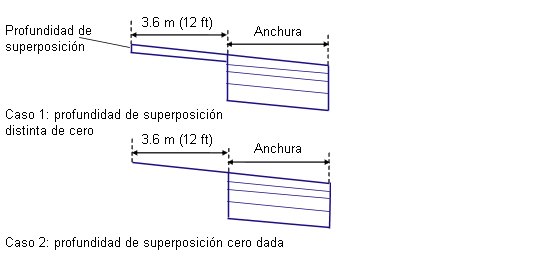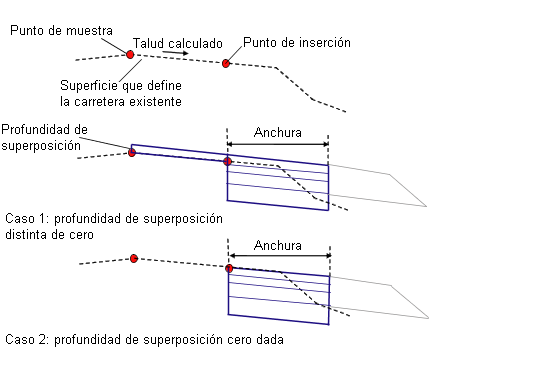 Se determinan las elevaciones del punto de muestra y el punto de inserción en la superficie existente y se calcula el talud desde el punto de muestra al punto de inserción. Se añade una capa de superposición por encima del carril existente con el mismo talud para la profundidad de superposición dada. Se crea una forma de superposición cerrada mediante la superposición de uno o varios vínculos sobre la pendiente existente. El carril de ensanchamiento se enlaza hacia fuera de la superposición en el desfase de inserción utilizando el talud calculado.