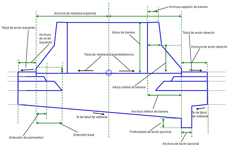 | Extensión de base izquierda | Anchura que la capa base se extiende más allá del borde del arcén pavimentado por el lado izquierdo hacia la mediana. Se proporciona aunque la anchura del arcén izquierdo sea cero. | Numérico, positivo |