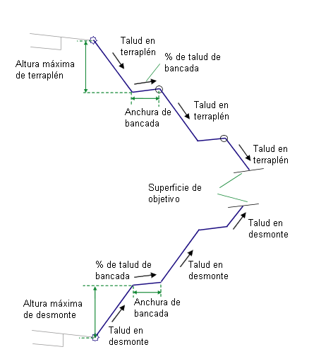En el modo de diseño, este subensamblaje dibuja los taludes iniciales en desmonte o terraplén hasta sus alturas máximas y una bancada simple seguida por taludes de intersección en desmonte o terraplén para la mitad de las alturas máximas. Los vínculos de intersección terminan con un extremo de cota que apunta hacia afuera.