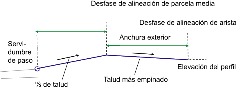 La herramienta del ensamblaje de pendiente de la parcela tiene que empezar en la servidumbre de paso y, de forma similar al subensamblaje CarrilTransiciónBásico, mantendrá la pendiente y cambiará el desfase hasta el centro de la parcela con un talud por defecto del 1%. El usuario puede especificar el valor del talud. En el centro de la parcela habrá una alineación sin perfil. De esta forma, el ensamblaje será un vínculo entre la servidumbre de paso y la alineación del centro de la parcela con un talud del 1%. A continuación, la alineación del centro de la parcela se enlazará a la parte posterior de la parcela, que tiene una elevación fija; por ejemplo, 74.00 pies. También es necesario mantener un talud mínimo del 1% en la mitad posterior de la parcela. Por tanto, se debe disponer de una regla si la pendiente de la parte delantera de la parcela con un talud del 1% no permite obtener un talud mínimo del 1% en la mitad posterior de la parcela. En ese caso, la pendiente de la mitad posterior de la parcela tiene que cambiar al 1% y la pendiente de la mitad delantera de la parcela tiene que aumentar.