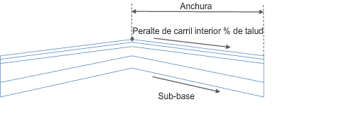 El talud de peralte del carril interior se obtiene a partir de las especificaciones de peralte para la alineación de línea base. Comenzando en el punto de enlace, se insertan una superficie de rasante y una capa base paralela con los valores de anchura, profundidad y talud de peralte indicados. Los vínculos verticales cierran la forma en cualquiera de los extremos del carril.