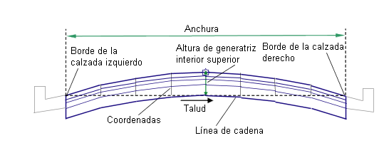 El centro de la línea de cadena se calcula restando la altura de bombeo al punto de enlace, mientras que los bordes derecho e izquierdo de la calzada se calculan aplicando la anchura y el talud simétricamente con respecto al punto de enlace. Las coordenadas de la curva parabólica se calculan a intervalos regulares a lo largo de la línea de cadena y, además, se añaden vínculos de línea recta para conectar los puntos de coordenadas. Para las superficies de pavimento1, pavimento2, base y sub-base se insertan superficies paralelas a partir de las profundidades indicadas.