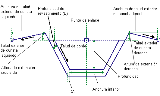 Si se omite la anchura del talud exterior de cuneta, el punto marcado derecho se posicionará en el punto exterior de la extensión de altura del canal. Si el vínculo de extensión de altura del canal también se omite, el punto marcado se posicionará en el último punto de la parte superior del canal.
