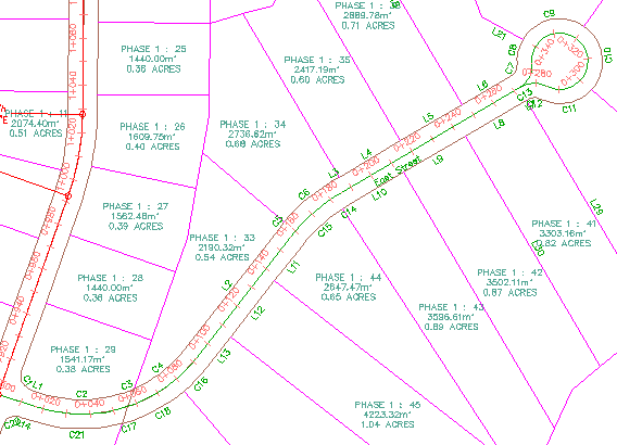 Cambiará la numeración de los indicadores de tabla de curva alrededor del callejón sin salida de la alineación East Street para que sigan un patrón en sentido horario. Utilizará el cuadro de diálogo Numeración de indicadores de tabla que examinó en el ejercicio anterior para especificar el número inicial y el incremento con el que se cambiará la numeración de los indicadores de tabla.