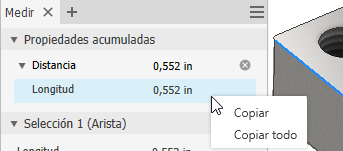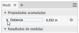- Para añadir una medida lineal, de área, de volumen y/o de ángulo a la sección Propiedades acumuladas: realice una selección en la ventana gráfica y, a continuación, haga clic en el signo más situado junto al tipo de medida. Por ejemplo, seleccione una línea en la ventana gráfica y, a continuación, haga clic en el signo más situado junto a la medida. El valor se añade al grupo de medidas Distancia en Propiedades acumuladas.