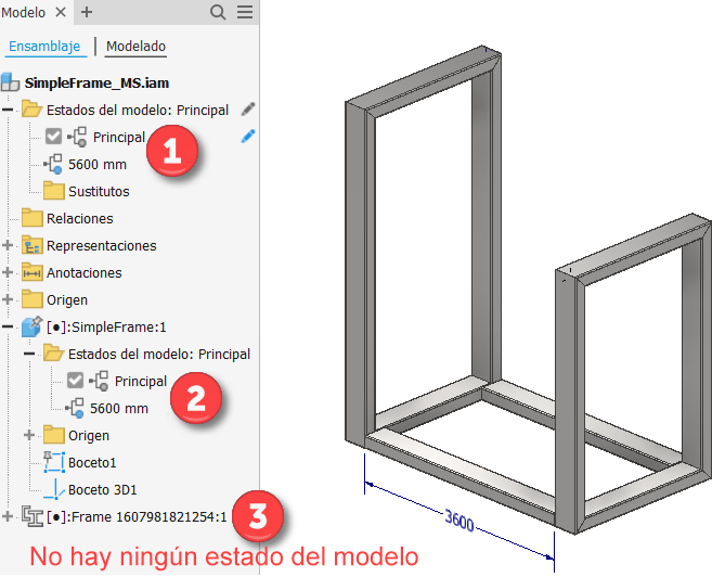 En la imagen siguiente, los estados del modelo de SimpleFrame_MS (1) consumen las cotas de boceto especificadas en el estado del modelo activo de SimpleFrame (2).