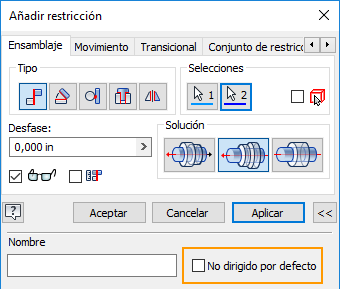 Por defecto, al crear una restricción axial, Inventor intenta predecir la mejor solución para su creación. La nueva configuración, No dirigido por defecto, permite volver permanentemente al comportamiento heredado que era no dirigido por defecto.