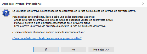 Los mensajes de gestión de errores que se muestran cuando intenta abrir un archivo que no se encuentra en la ruta de búsqueda del proyecto activo se han actualizado para proporcionar una explicación más útil sobre cómo resolver el problema: