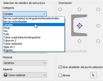Se ha añadido una nueva sección Categoría a Selección de miembro de estructura en el comando Insertar y cambiar para mejorar la búsqueda de una familia concreta. Al seleccionar una categoría de forma estructural, la lista Familia se filtra para mostrar únicamente las opciones disponibles.