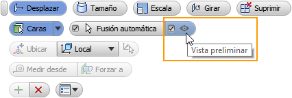 Se ha añadido un botón de vista preliminar a la barra de herramientas pequeña de edición directa principal para todas las operaciones (Desplazar, Tamaño, Escala, Girar y Suprimir).
