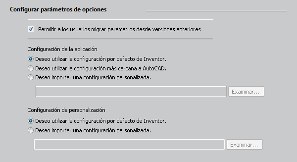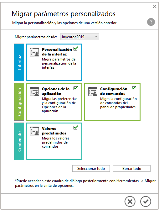 Si se detecta una versión anterior al instalar Inventor 2019, aparecerá el cuadro de diálogo Migrar parámetros personalizados. Utilice este cuadro de diálogo para actualizar Inventor con sus configuraciones de personalización y Opciones de la aplicación sin necesidad de utilizar el proceso de importación/exportación de xml.