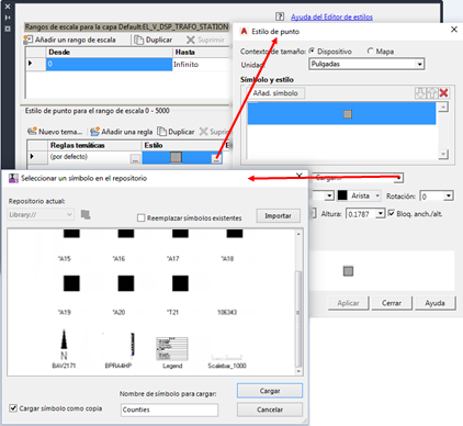 - En el Editor de estilos, en Estilo de punto para el rango de escala 0 - Infinito, pulse el botón Examinar de la columna denominada Estilo. Defina los parámetros de la siguiente forma: