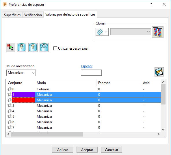 Es parecido a la pestaña de Superficies, excepto que los valores aplicados aquí son valores por defecto aplicados a todos los límites y trayectorias nuevos. Las trayectorias o límites existentes no se modifican con los cambios realizados aquí.