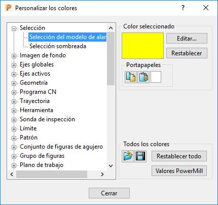 Restablecer todo — Cambia la selección de colores a la que había cuando se inició PowerMill.