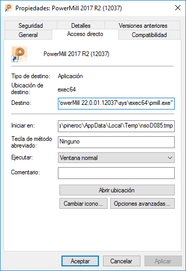 del escritorio y seleccione Propiedades. Se abrirá el cuadro de diálogo Propiedades de PowerMill.