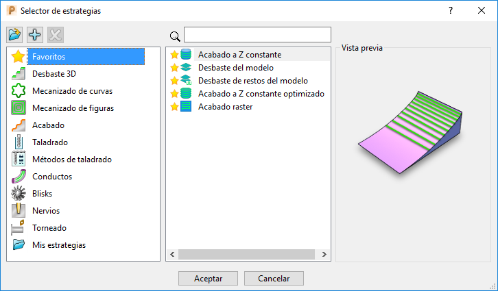 El cuadro de diálogo de Selector de estrategias presenta las estrategias disponibles para la creación de trayectorias. Cuando selecciona una estrategia, PowerMill abre el cuadro de diálogo de Estrategia, que permite especificar los parámetros y requisitos de la trayectoria.