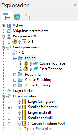 El explorador muestra las entidades utilizadas en un proyecto de PowerMill. (El término entidad se refiere en sentido amplio a todas las entradas en el explorador). Las entidades en el explorador están agrupadas por tipo, por ejemplo, las trayectorias de herramienta se agrupan en la rama de Trayectorias y las herramientas se agrupan en la rama de Herramientas. Debido a que es frecuente que los proyectos de PowerMill contengan muchas entidades, el explorador utiliza un sistema Activo para indicar en qué entidades se concentra.