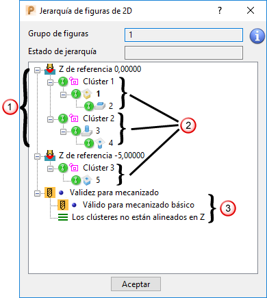 Es posible generar una jerarquía de todas las figuras dentro de un grupo de figuras describiendo las relaciones de subordinación de las figuras contenidas. De este modo es posible identificar rápidamente problemas que impidan el mecanizado de un grupo de figuras.