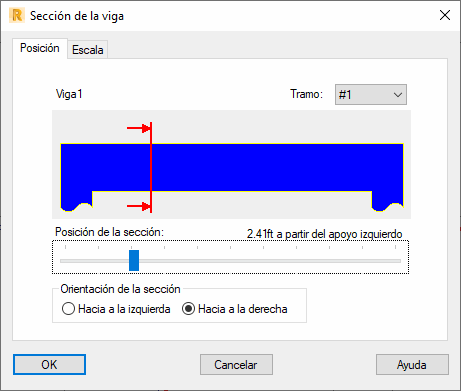 En la ficha Nivelación del cuadro de diálogo Sección de la viga, puede seleccionar la sección transversal y el tramo de una viga que se muestran en el plano de ejecución.